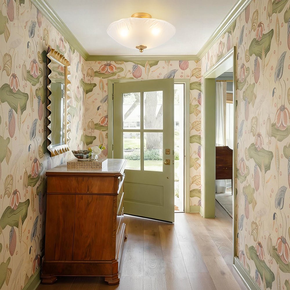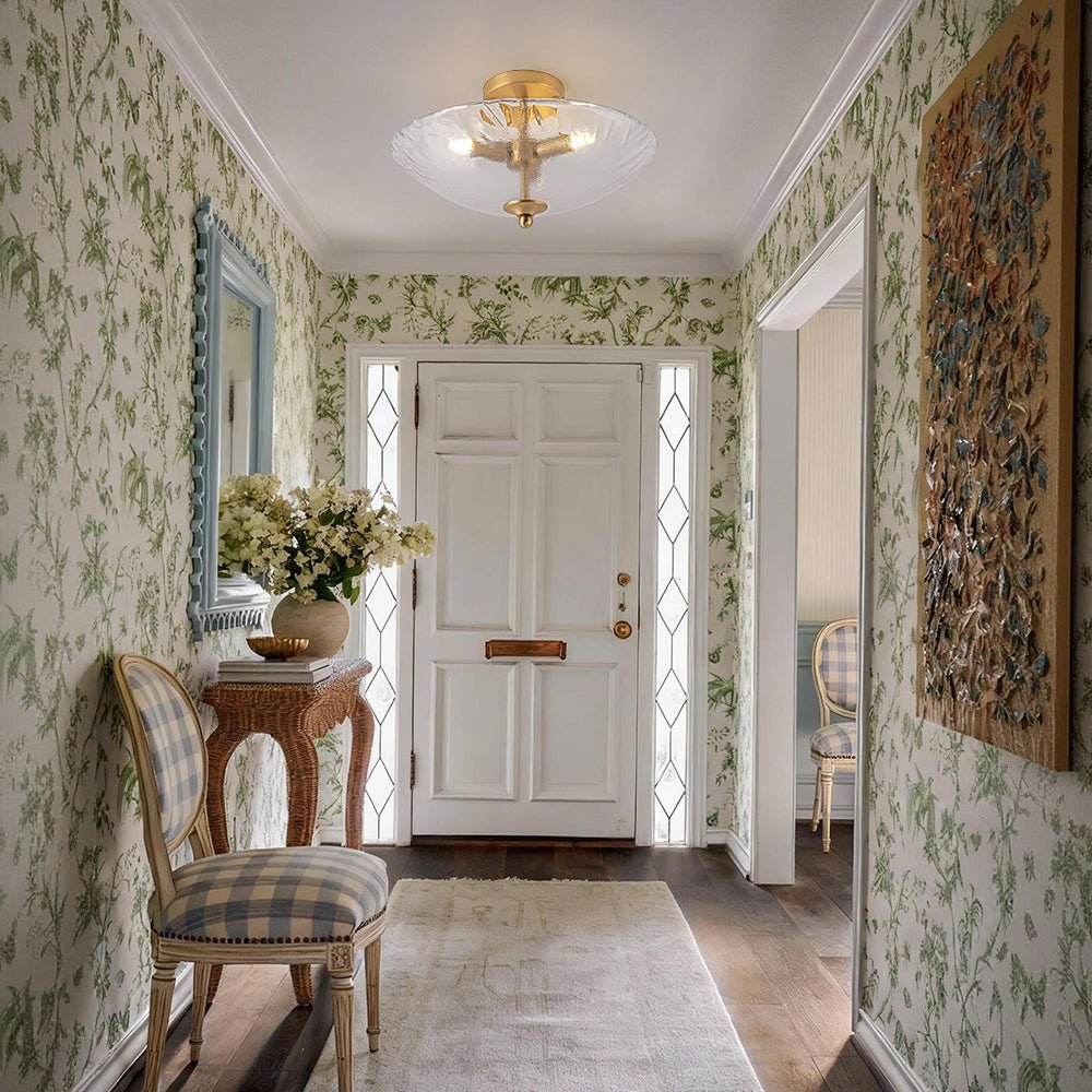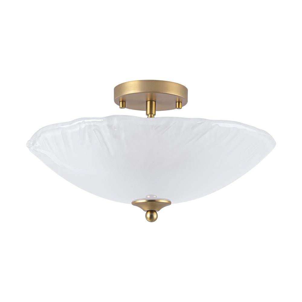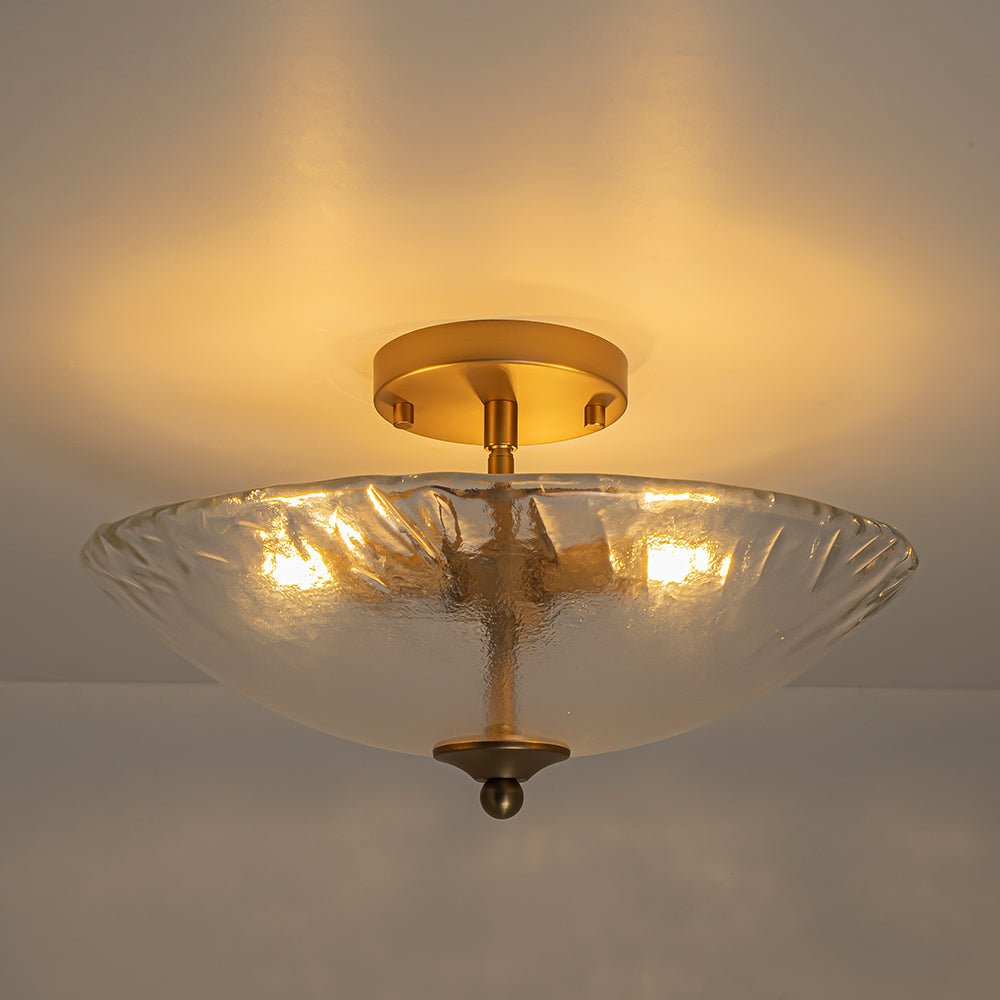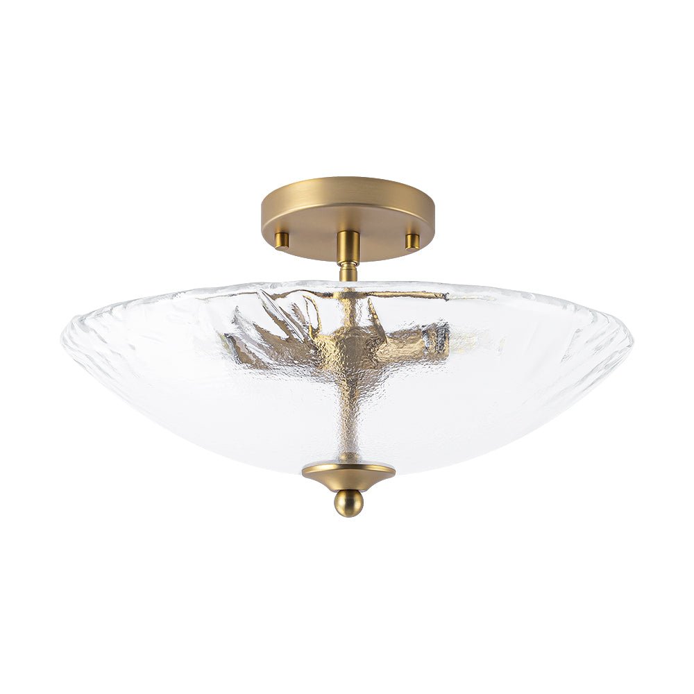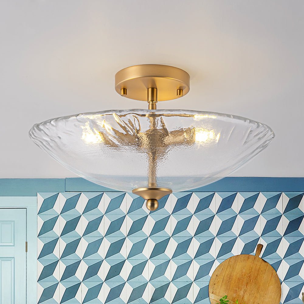 Striking the perfect balance between refined artistry and subtle charm, this 3-light round glass semi-flush mount delivers both style and function. A saucer-like shade is crafted from hand-formed glass, its sleek yet subtly irregular edge rippling like the hem of a silk gown, bringing dynamic texture and graceful movement to any space. Choose between crystal-clear glass with a sanded texture, evoking the icy shimmer of frozen light, or inner-frosted glass, which softens illumination to create a warm, dreamy ambiance. Set against a warm brass frame, the fixture exudes mid-century modern charm, balancing sculptural form with refined simplicity. Low-profile yet striking, this glass bowl ceiling light can be used singly to accent an entryway, bathroom, bedroom, closet, laundry, or stairwell, or in a linear arrangement above a hallway, kitchen island, or dining table, casting a gentle, radiant glow while adding subtle dimension and timeless sophistication.