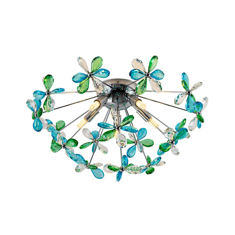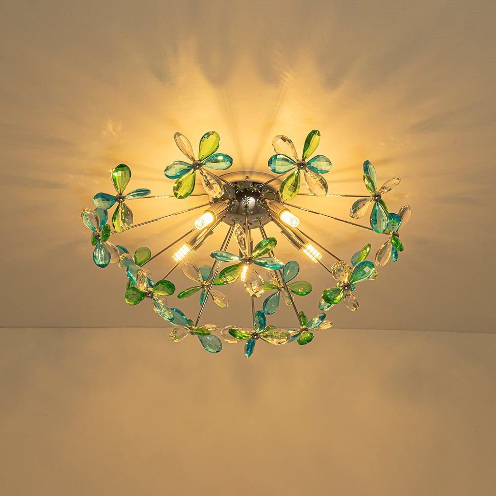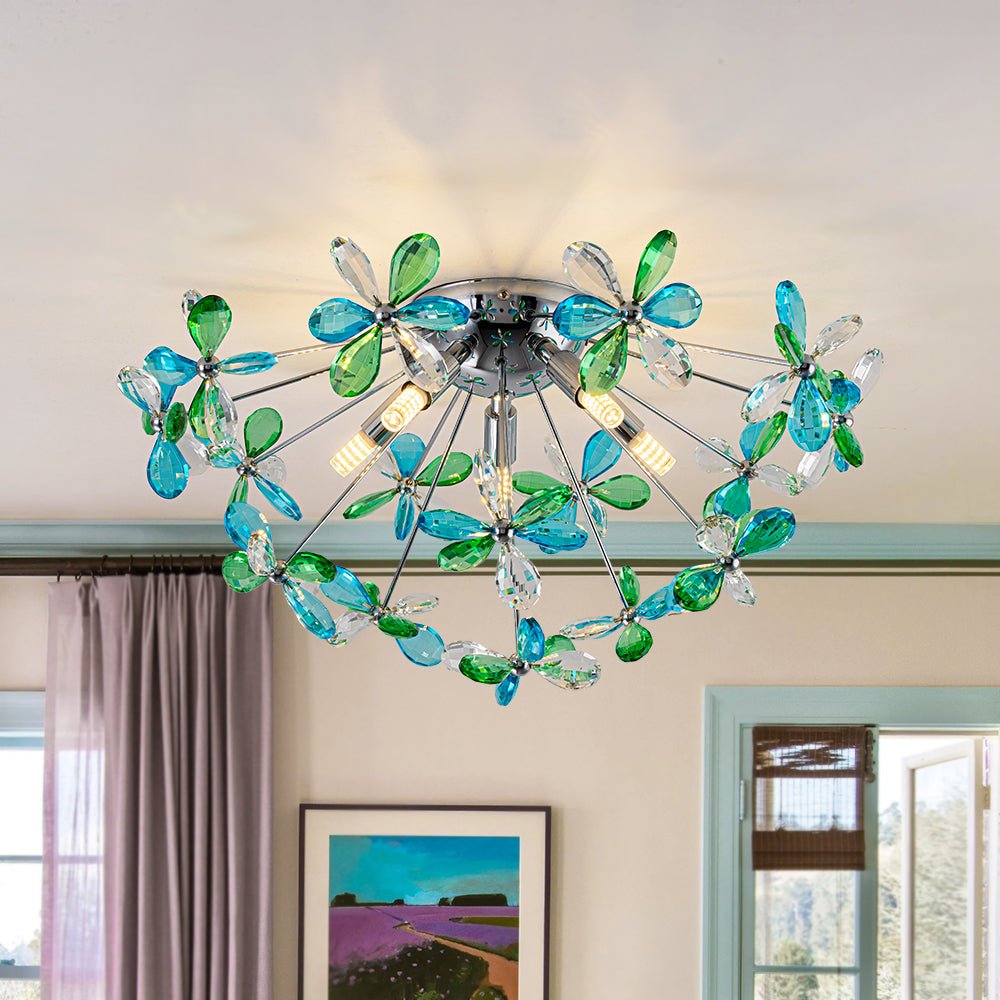 Radiating a harmonious balance of color and brilliance, this crystal dandelion semi-flush mount light captivates while complementing any space. Featuring finely crafted crystal flowers with a mixed crystal palette, precision-cut crystals in clear, blue, and green are arranged evenly across the fixture, catching and refracting light from every angle to fill the room with vibrant reflections and a dazzling play of color.