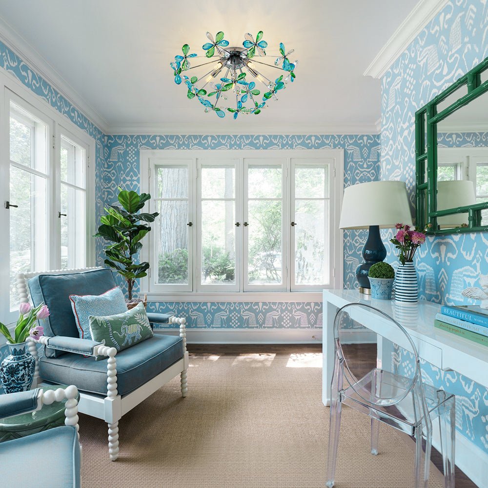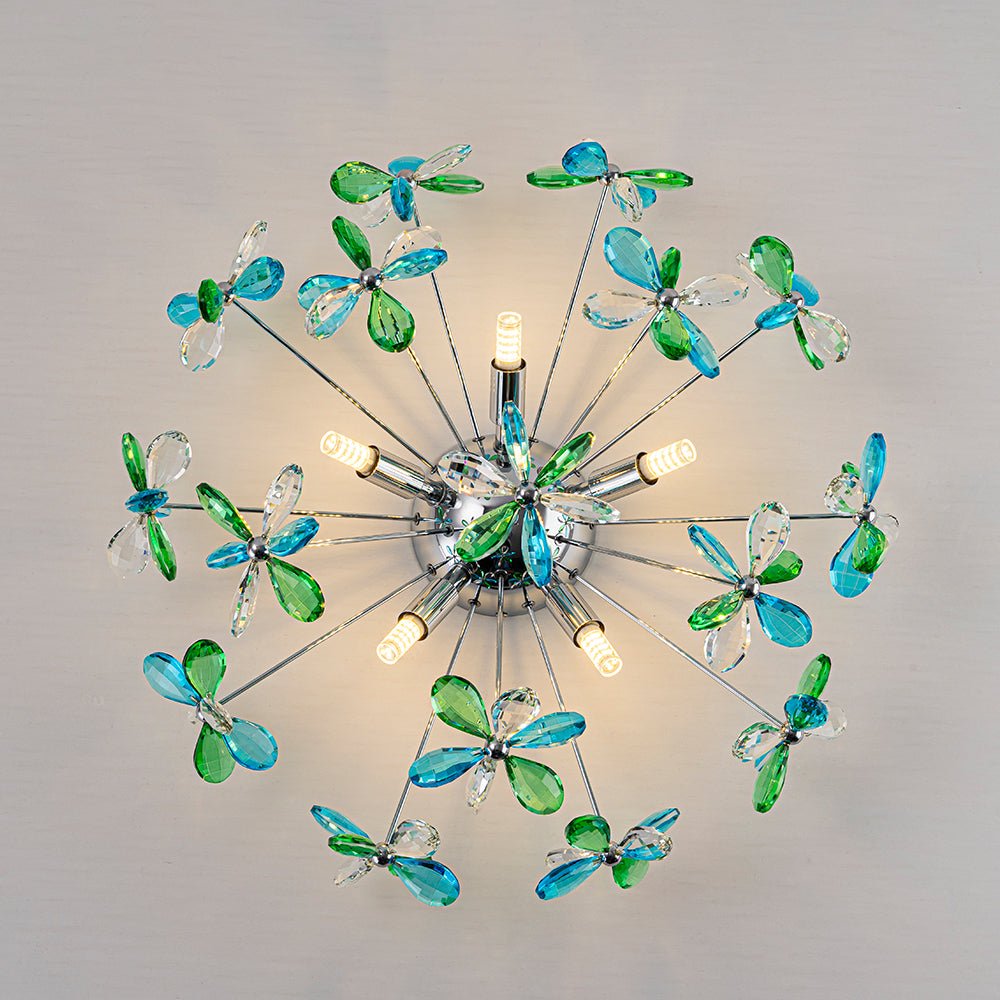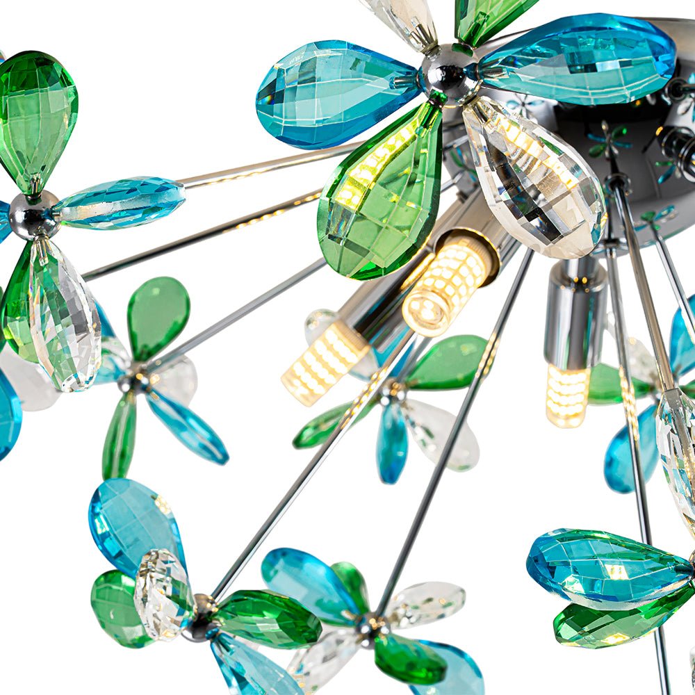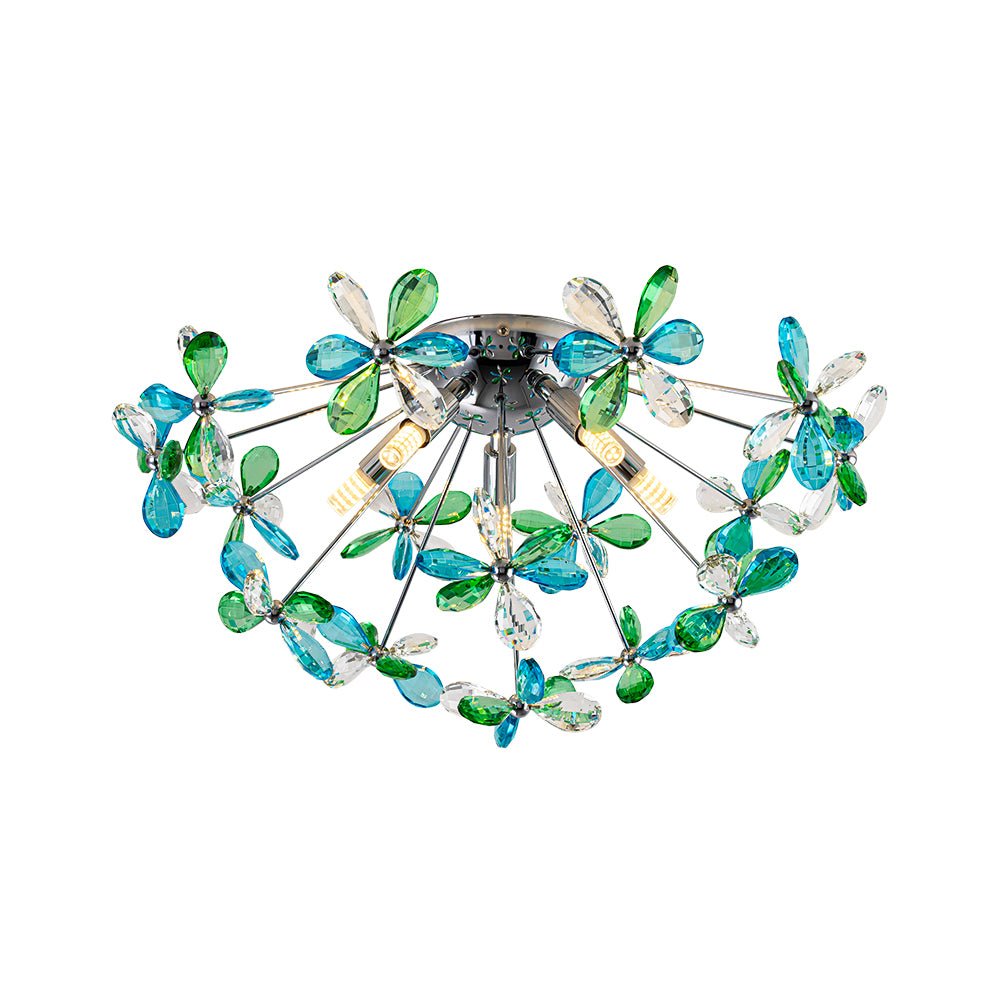 Radiating a harmonious balance of color and brilliance, this crystal dandelion semi-flush mount light captivates while complementing any space. Featuring finely crafted crystal flowers with a mixed crystal palette, precision-cut crystals in clear, blue, and green are arranged evenly across the fixture, catching and refracting light from every angle to fill the room with vibrant reflections and a dazzling play of color.