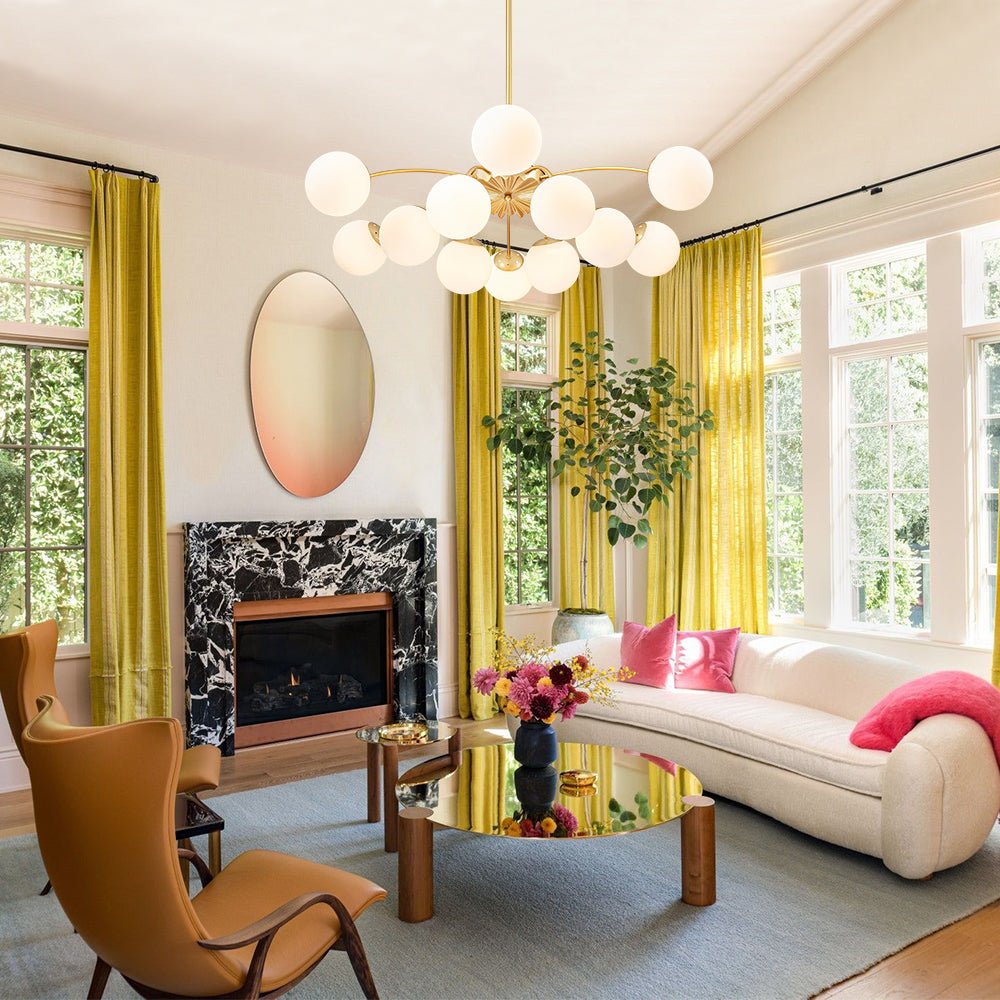 An opulent fusion of classic Sputnik and elegant bubble design, this 12-light semi-flush chandelier features gracefully curved arms cascading from the back of a medal-like base to support alluring milky white glass globes, like a beautiful blossom firework. Warm cozy lighting sweeps down to your space when we turn on this glass globe sputnik chandelier, flowing through frosted glass bubbles and the luxe brass frame with elegance. Perfect to add artful charm and sophisticated beauty to your home decor, this 12-light opal glass bubble chandelier funky chandelier is the best enhancement to a living room, dining room, entryway, bedroom, or lobby.