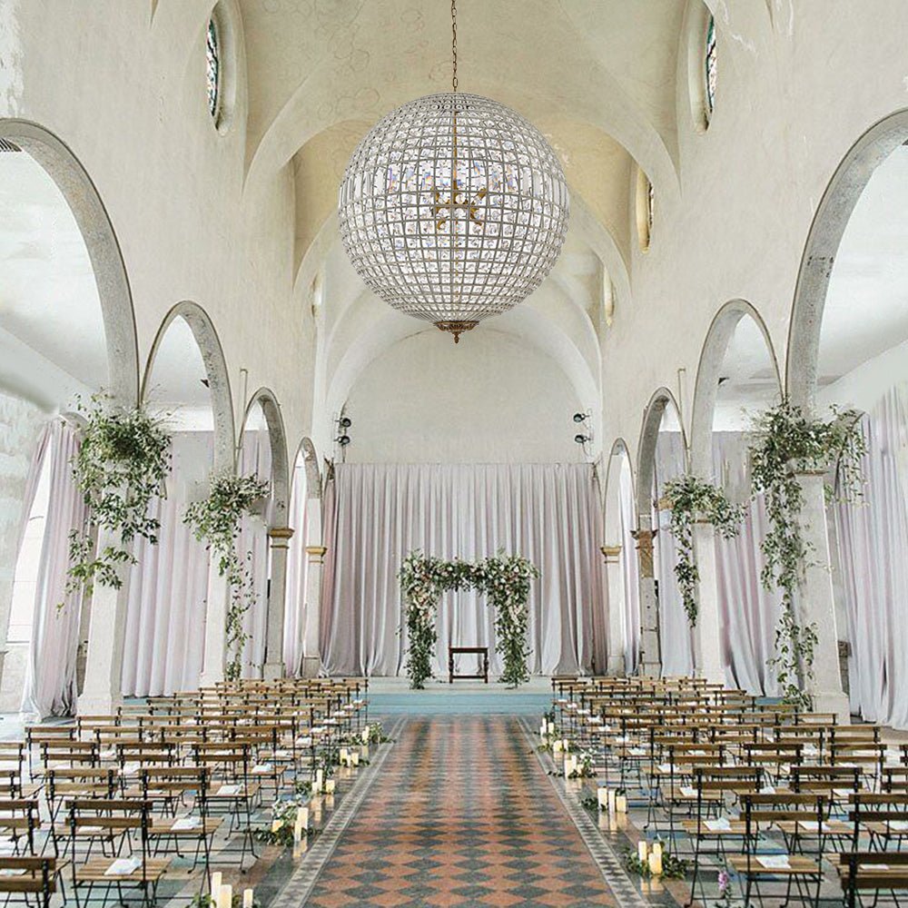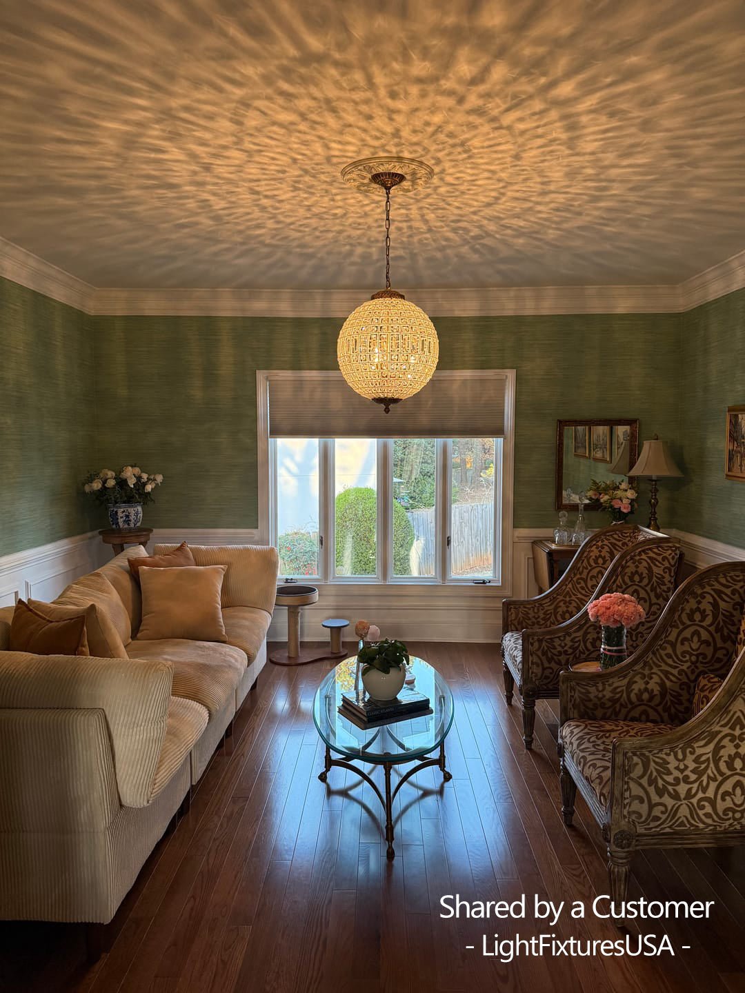 Welcome a gorgeous and vintage-chic vibe to your space with this orb pendant light. Finished in antique brass, this crystal ball chandelier boasts its classic and chic French style. Varying sizes of faceted glass crystal fill in an open orb frame to create this magnificent crystal globe chandelier. The bulbs (not included) cast from inside to sparkle out through the crystal decorations will upgrade the ambiance in the space. This French wide crystal globe chandelier produces unforgettable glitter to your dining table, living room, entryway, lobby, or hotel.