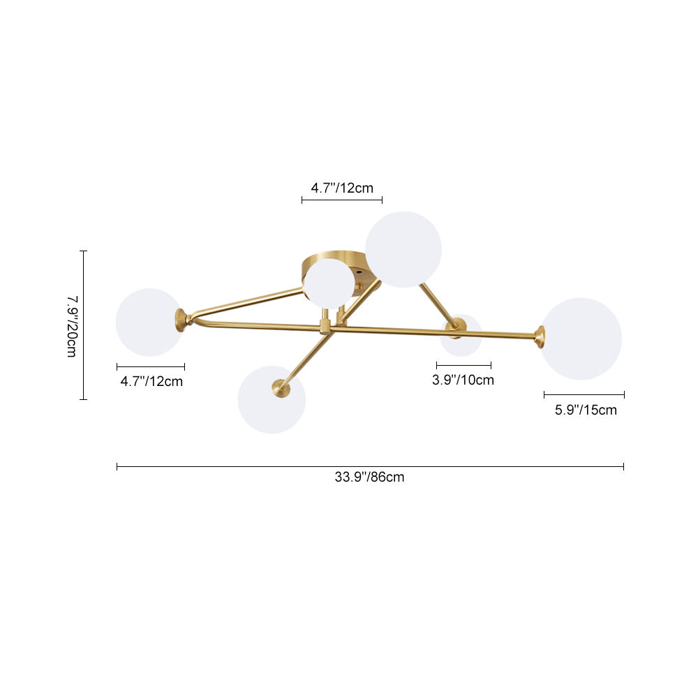 Clever in reference to sputnik and linear style, semi flush mount ceiling light shows an entertaining geometric frame finished in brass. Six frosted glass globes highlight the modern elegant look of this linear sputnik semi flush mount light. Accommodated G9 bulbs (not included), this brass sputnik ceiling light is compatible with a dimmer kit to cast ambient lighting. Perfect for a living room, hallway, bedroom, dining room, and foyer, this bubble linear sputnik semi flush mount will bring a fresh breeze to your modern or mid-century home decor.