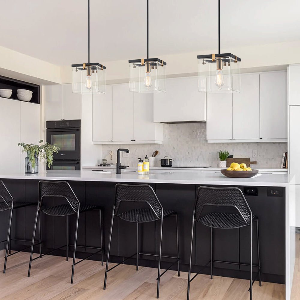 Introducing our 1-light glass kitchen pendant lightāwhere simplicity meets sophistication. This contemporary minimalist hanging light features a matte black square frame suspended with four clear glass panels, forming a sleek and trendy rectangular cage. The open design and transparent glass allows the E26 medium-base bulb (not included) to cast a bright, unobstructed glow, illuminating your space with elegance. The aged brass socket and accents add a pop of color and refinement, enhancing the pendant's overall appeal. Ideal for elevating any space, whether it's a kitchen island, dining room, bedroom, bathroom, foyer, office, or living area, this clear glass square cage pendant light can be hung individually or in multiples for a striking linear arrangement.