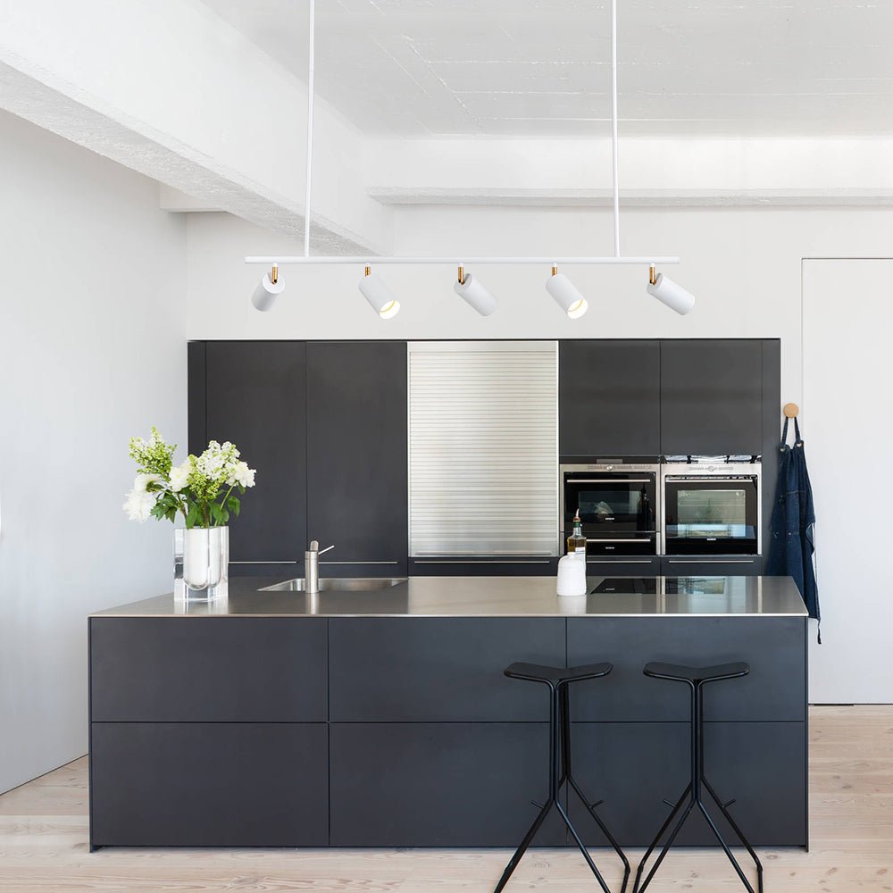 Boasting its chic minimalist and functional design, this 5-light kitchen island pendant will make your space shine with contemporary luxury. This linear island chandelier features five direction-adjustable cylinder spotlights sitting on a horizontal pole, providing a trendy uniform row of illumination perfect for any kitchen island, dining room, long table area, or living room. Available in four color schemes, this modern 5-light island linear track light offers a wide range of applications to complement most kinds of room hues.