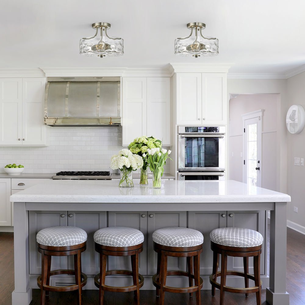 This round flush mount lighting comes in a 3-arm metal frame in nickel finish, which supports a drum-shaped hammered glass shade at the bottom. Designed to take two E26/E27 medium-base bulbs (excluded), this hammered glass semi flush ceiling light offers glistening lighting like the water ripple to wash your ceiling and space. We love to mount this brushed nickel ceiling light to the entryway, bathroom, kitchen, corridor, and bedroom.