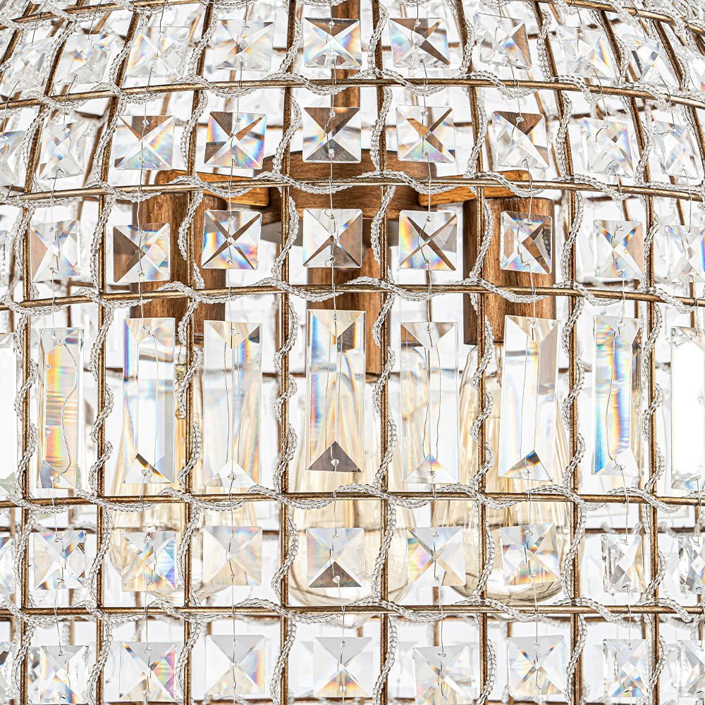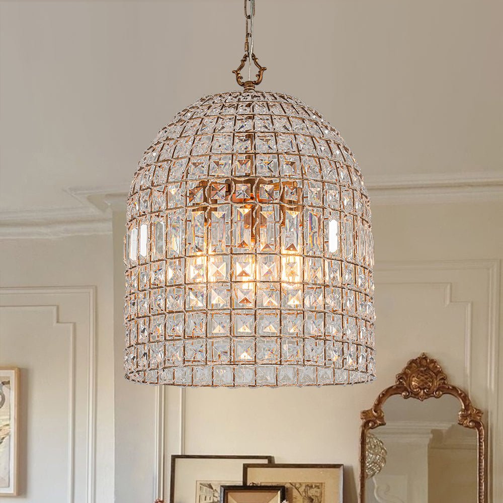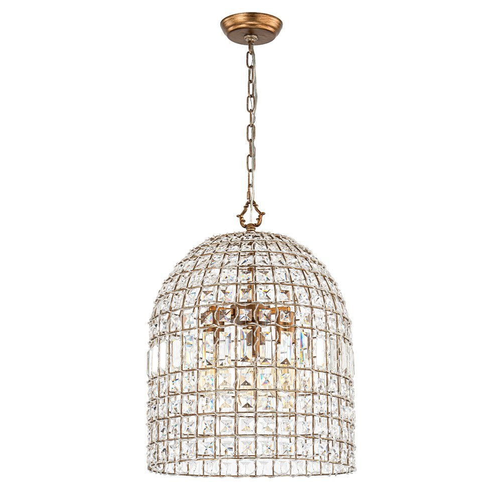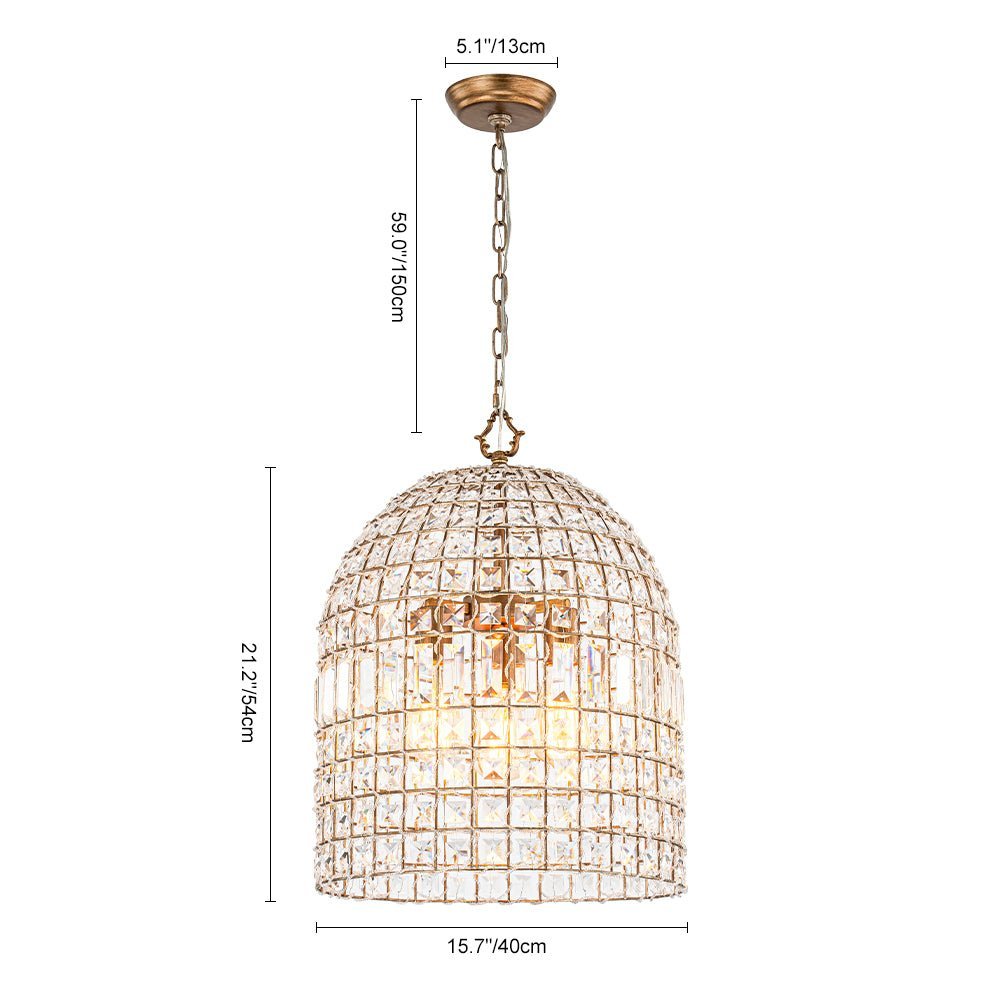 Bound to infuse a touch of French opulence and glamorous elegance into your decor, our crystal cage chandelier serves as both a light source and a stunning piece of art. Inspired by a traditional bird cage, this lantern chandelier features an open frame with a sleek dome top, adorned with beautiful cut crystals and delicate bead strands. It is painted in distressed gold to evoke an antique brass texture, adding a classic shabby chic vibe. Inside the cage, one or three E26 bulbs (not included) cast a warm light that envelops the vintage frame, streaming through the dazzling crystals with a sparkling grace. This exquisite crystal cage chandelier exudes an unparalleled level of romantic refinement, making it the perfect enhancement for a modern living room, entryway, dining room, bathroom, or bedroom.