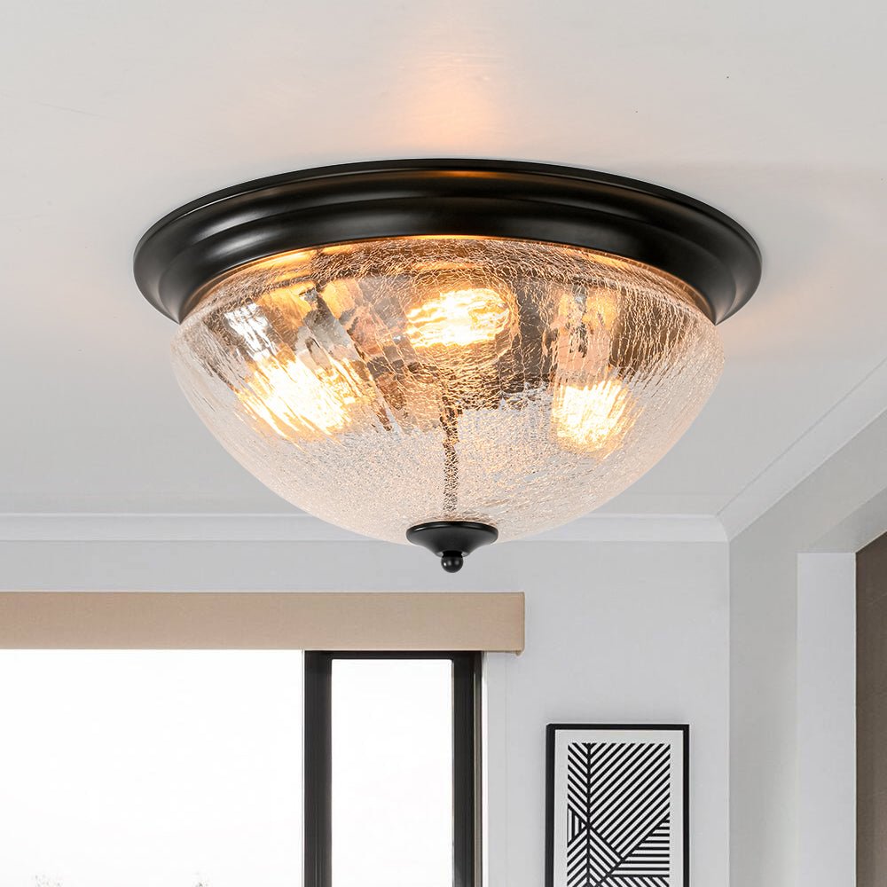 This round ceiling light seamlessly combines modern farmhouse charm with contemporary elegance. The standout of this flush mount light is its bowl-shaped shade, made of crackled glass, showcasing a striking yet captivating design. Illuminated by three E26-base medium bulbs (not included) within the textured shade, this glass flush mount light creates an alluring ripple-like ambient glow. It serves as a beautiful enhancement for entryways, dining rooms, bedrooms, kitchens, bathrooms, or foyers.