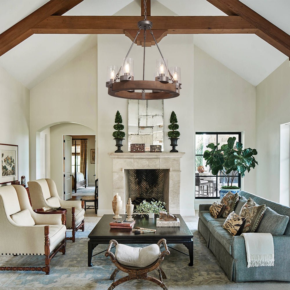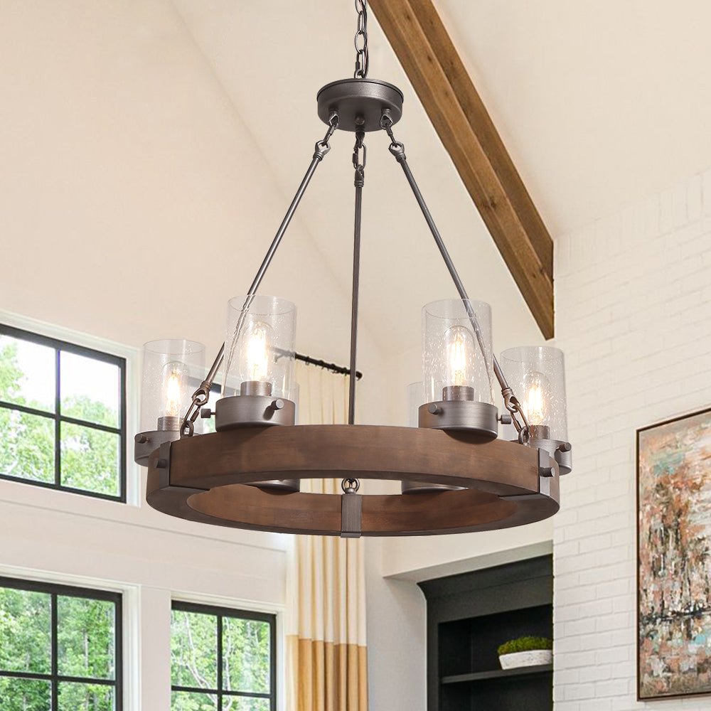 Six cylindrical seeded glass shades sit on a thick natural wood ring to construct this rustic 6-light wagon wheel chandelier. Finished in antique brushed silver, the metal hanging rods and chain add an industrial accent to this farmhouse circular chandelier. Accommodated E26/E27 medium-base bulbs (excluded), this brown wood wheel chandelier delivers an iconic way of yielding barn or cottage results in your living room, dining room, bedroom, kitchen island, or entryway.